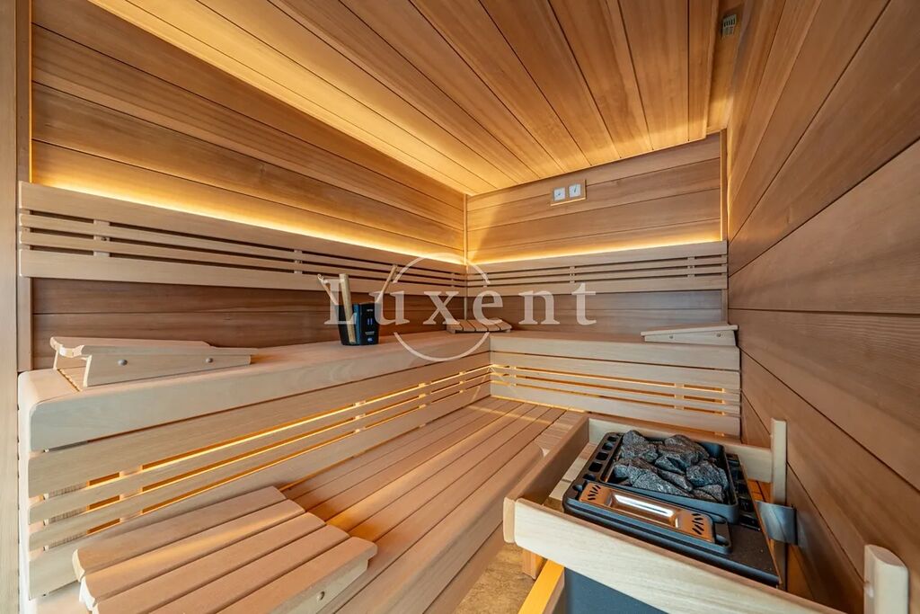 Součástí pozemku je privátní wellness zóna s vyhřívaným bazénem (8x4m), finskou saunou, letní kuchyní a stylovou odpočinkovou místností s mechovou stěnou a krbem, která nabízí perfektní zázemí pro relaxaci i společenské setkávání.