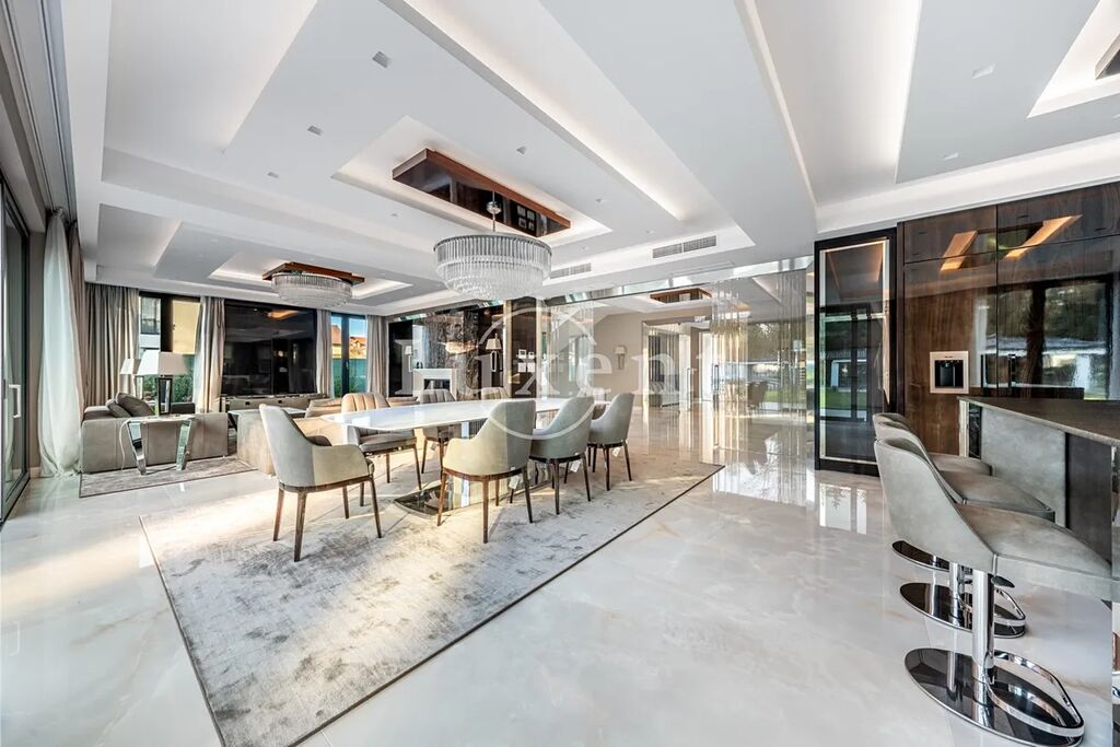 Vstupní část tvoří předsíň a prostorná hala s úložnými prostory a skleněnými posuvnými dveřmi, která plynule přechází do otevřeného společenského prostoru. Dominantou je prémiová kuchyně SieMatic se spotřebiči Miele, navazující jídelna s masivním stolem Wedge a velkorysý obývací pokoj s moderním krbem. Celý prostor prosvětlují velkoformátová francouzská okna, jež zároveň propojují interiér se zahradou a dodávají místnostem výjimečnou vzdušnost. Atmosféru podtrhují ručně vyráběné křišťálové lustry na míru. V prvním podlaží se dále nachází technická místnost, prádelna, spíž a samostatná toaleta.