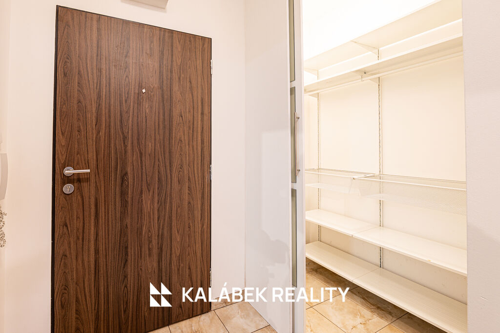 K bytu je možné si pronajmout i garážové stání za 2,000 Kč. Stání se nachází v přízemí hned u vjezdu do garáží. Zároveň je širší i delší, než je standardní norma. Lze pohodlně zaparkovat i dodávku typu VW Multivan.