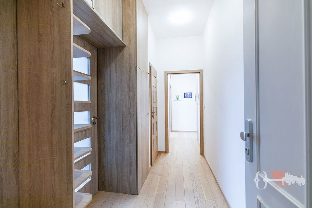 Interiér působí svěže a útulně díky dřevěným podlahám z běleného dubu, které dodávají prostoru lehkost a nadčasovost. Kuchyně pochází od výrobce, pro kterého je kuchyně skutečným srdcem každého domova, a je navržena tak, aby přinášela radost z vaření i společných chvil. Vestavěné skříně na míru nabízejí úložné prostory, které dokonale respektují dispozici bytu a budí příjemný pocit pořádku a elegance. Koupelna je vybavena kvalitní sanitou od uznávaného německého výrobce a v bytě nechybí ani moderní radiátory s termostaty, díky nimž lze snadno navodit příjemné klima.