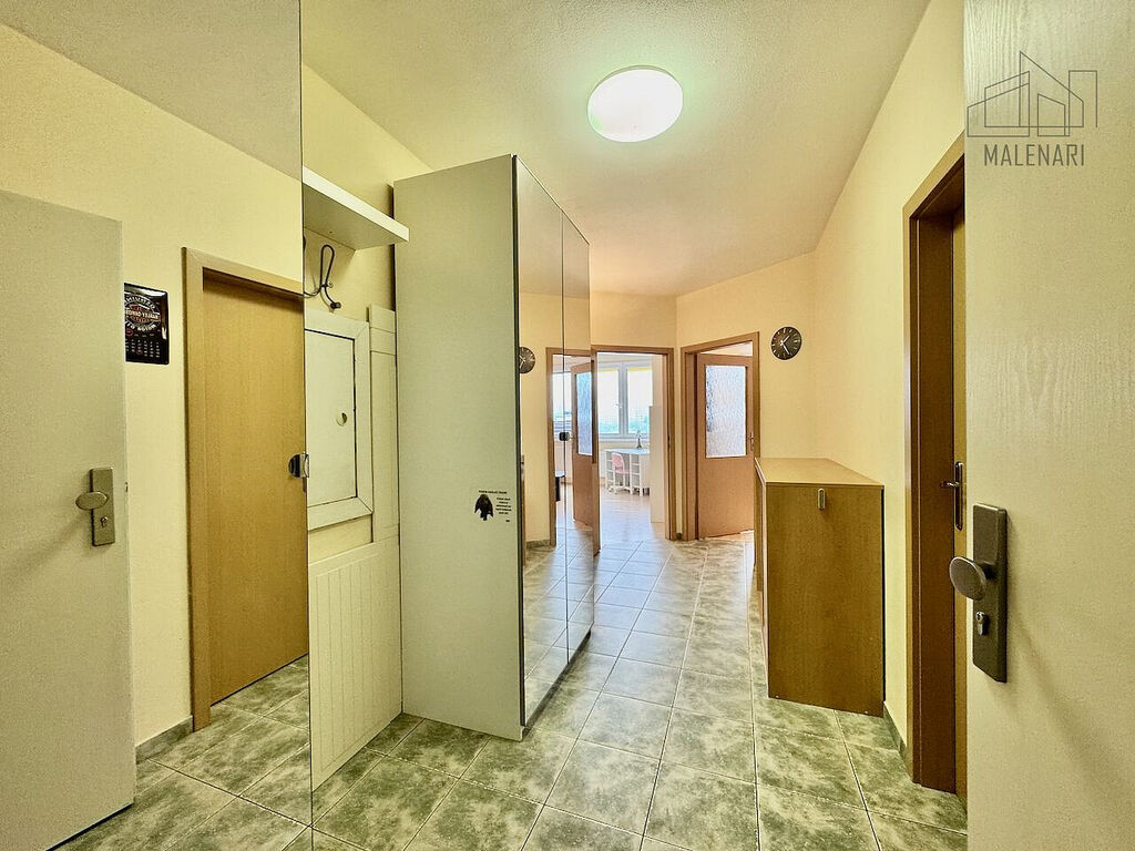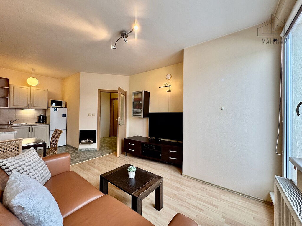 Byt má velmi prostornou vstupní halu (cca 9,13 m²), ze které je vstup do obývacího pokoje (cca 11,07 m²) s kuchyňským koutem (cca 5,86 m²), do ložnice (cca 9,84 m²), koupelny (cca 4,47 m²)), samostatné toalety (cca 1,58 m²) a komory (cca 1,5 m²). Z obývacího pokoje je vstupu na terasu (cca 4,38 m²), ze které je hezký výhled s JV orientací. Byt je ve velmi dobrém stavu s možností rychlého nastěhování.
