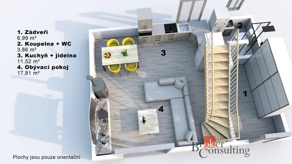 Vstupní chodba, koupelna s masážní sprchou a toaletou a prostorná kuchyň propojená s obývacím pokojem. Z obývací části vedou schody do patra / podkroví, zároveň je zde velké francouzské okno, kterým se vstupuje přímo na zastřešenou venkovní terasu s nádherným výhledem do přirody na koně a ovečky.