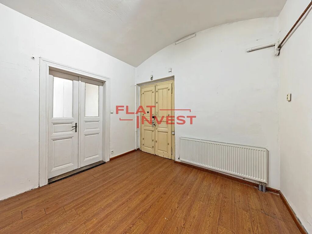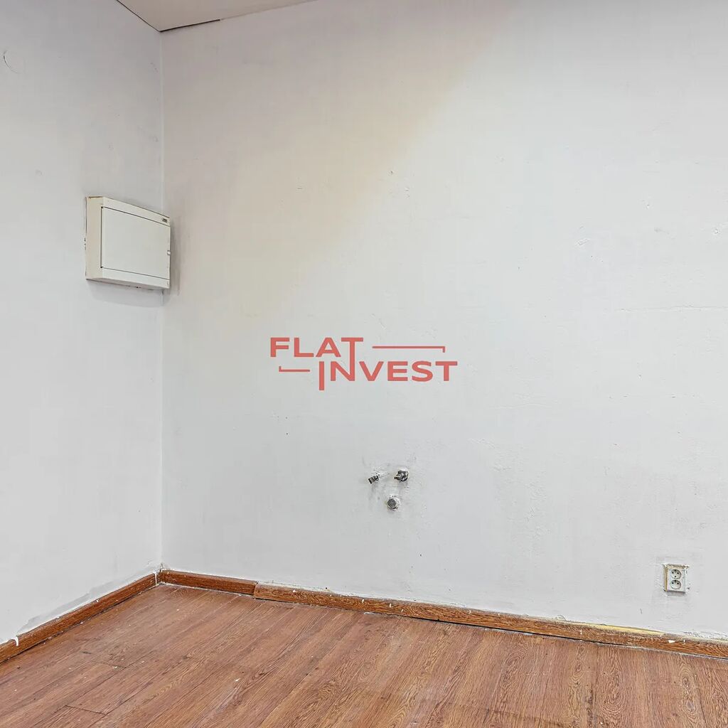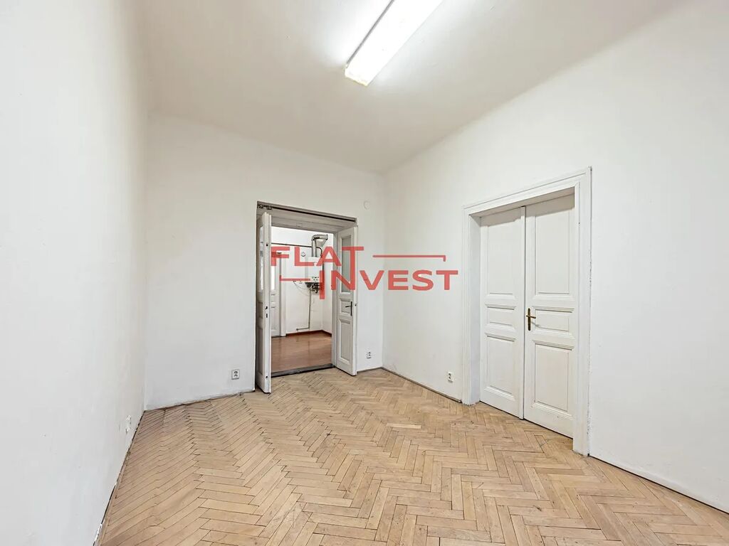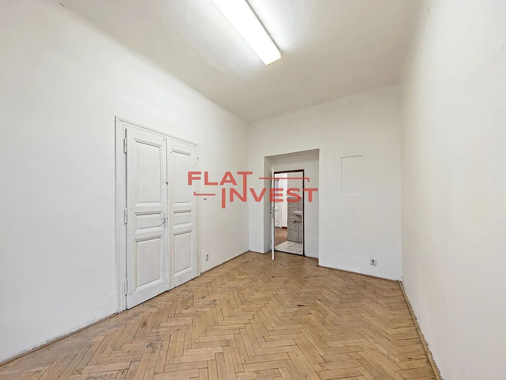 Prostory jsou vyklizené a čisté, bílé stěny a dřevěné parkety na podlaze, připravené pro budoucího nájemce.