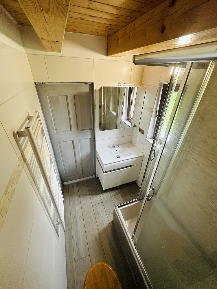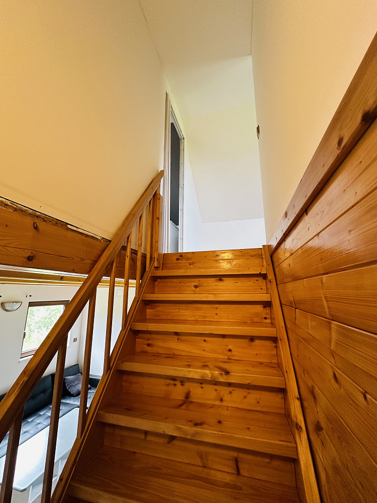 Součástí pozemku je kvalitně postavená dřevostavba o užitné ploše cca 50 m², která byla realizována jako první etapa plánovaného rodinného domu. Nejedná se o rekreační chatu – stavba je konstruována jako plnohodnotné celoroční bydlení s nadstandardní skladbou obvodových stěn, nízkou energetickou náročností a připraveností pro následné rozšíření podle platného stavebního povolení.