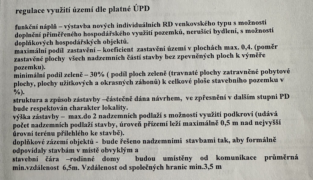 Maximální podíl zastavění: Koeficient zastavění území max. 0,4 (poměr zastavěné plochy všech nadzemních částí stavby bez zpevněných ploch k výměře pozemku).