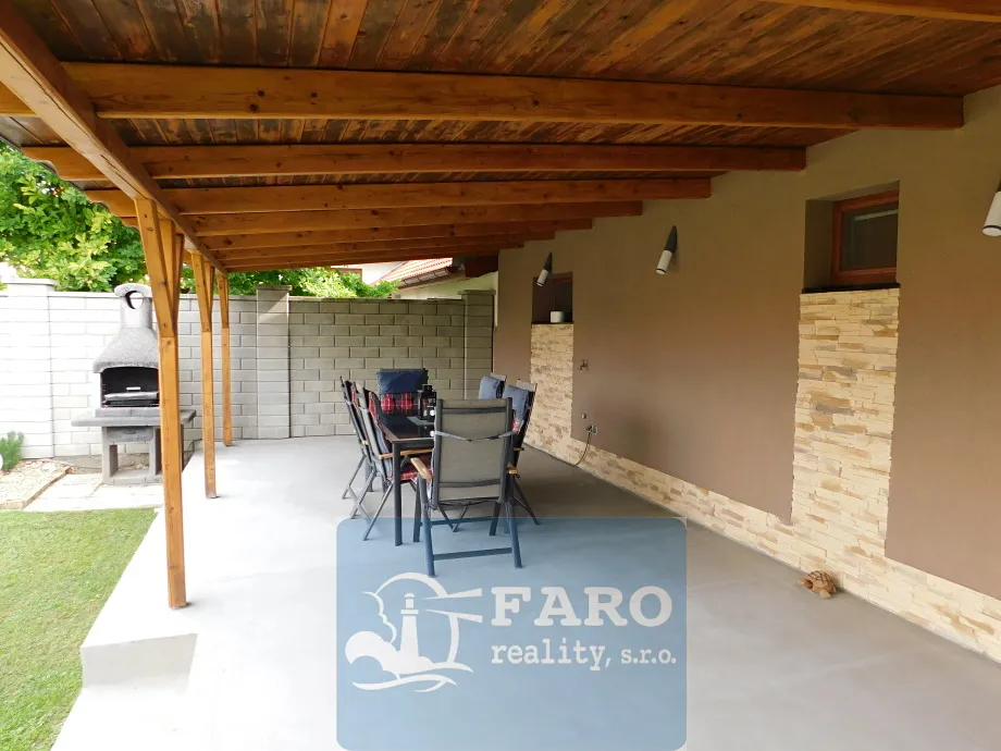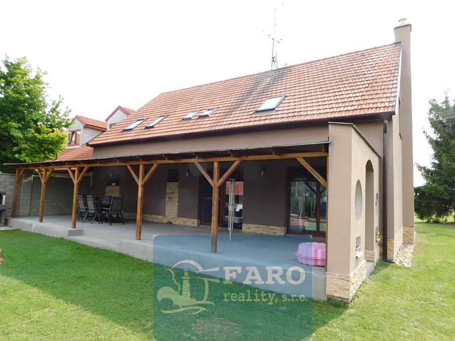Nabízíme k prodeji prostorný rodinný dům v obci Bantice u Znojma s dispozicí 4+1+ šatna, garáží a zastřešenou terasou. Dům se nachází v centru obce, mimo hlavní silnici. Dům je ve výborném stavu, je připojen na veškeré IS – voda, plyn, veřejná kanalizace, elektřina. Dům je zateplený – 20 cm, má plastová okna a novou fasádu, což positivně ovlivňuje měsíční náklady na provoz domu, 5.000,- Kč/měs. V obývacím pokoji je komín pro krbová kamna, která mohou přispět k další úspoře nákladů. V přízemí domu je garáž – 25m2, kde je umístěn plynový kotel se zásobníkem teplé vody, vstupní chodba – 7m2, kuchyň s jídelnou – 20m2, obývací pokoj – 27m2, samostatná toaleta, spíž, koupelna s vanou – 11m2 (nutná modernizace). V 1. patře je naproti schodišti hala – 16m2 se vstupem do šatny, ložnice – 14m2, koupelny s WC a dvou velkých dětských pokojů – 25, 30m2. Obytná plocha je 165m2. Z obývacího pokoje je vstup do zahrady přes velkou zastřešenou terasu – 55m2, která je po celé šíři domu a skýtá i za nepříznivého počasí velký prostor k odpočinku. Součástí zahrady je zděný bazén, zahradní domek a vlastní studna (zalévání + napouštění bazénu). Dojezd do Znojma – 10 km, do Brna – 50 km. Dům je ihned volný.