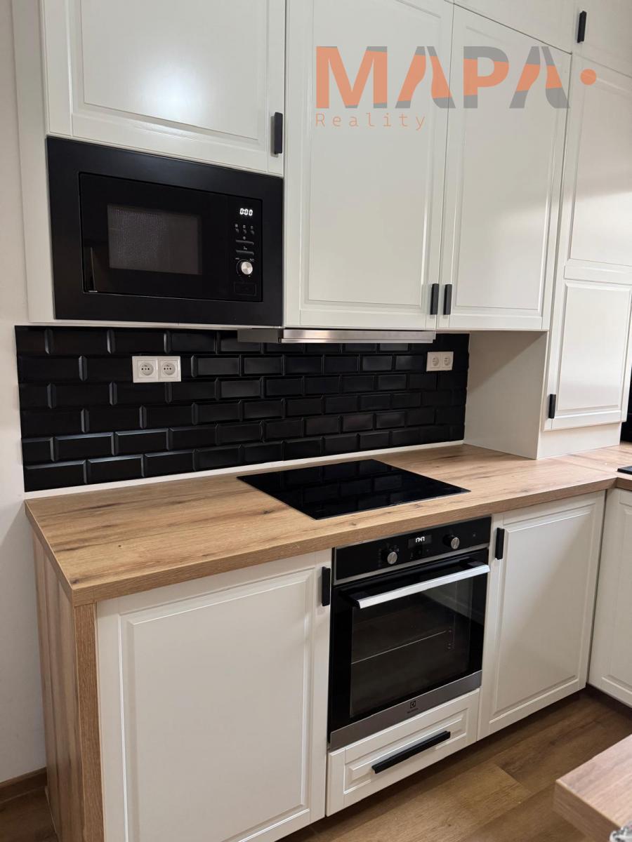 nová kuchyňská linka včetně spotřebičů: vestavná lednice, myčka, trouba, mikrovlnná trouba, digestoř a indukční varná deska