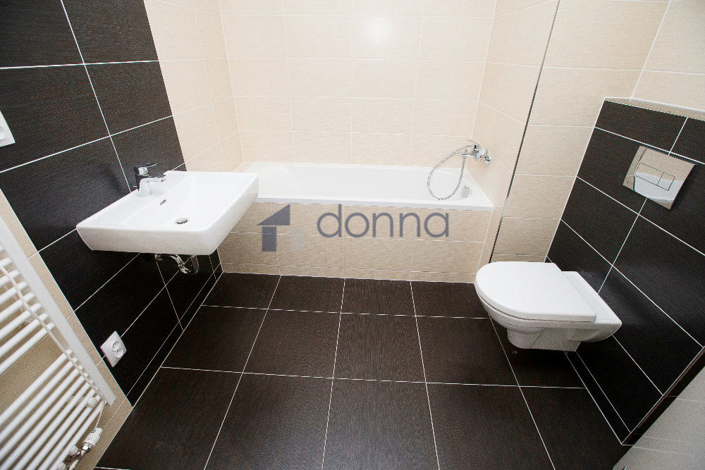Plovoucí podlahy, dlažba. V koupelně je vana a wc.