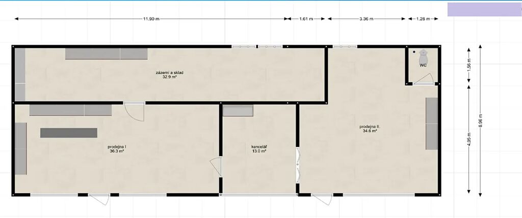 - prodejní plocha 36,3 a 34,6 m² s pěti prosklenými výlohami a dvěma přímými vstupy z ulice
