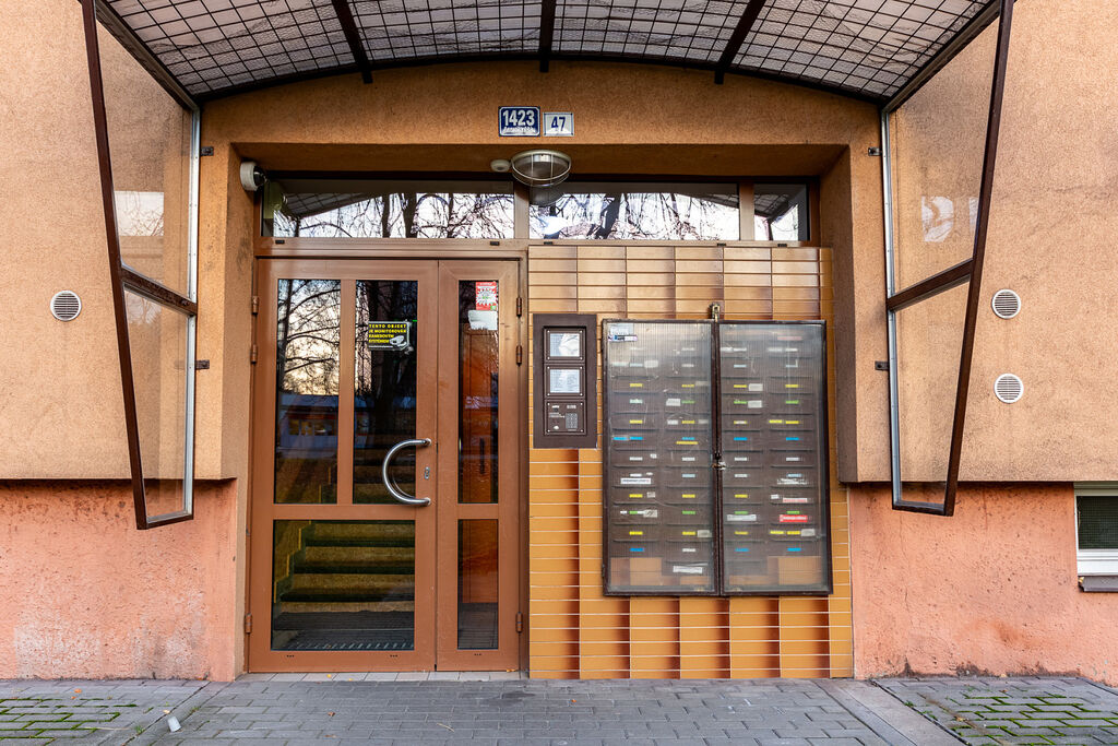 Dům má jediný vchod a jedenáct pater, a už první krok dovnitř napoví, že se o něj starají lidé, kterým na něm opravdu záleží. Vše perfektně čisté, tiché, upravené. Elegantně sjednocené vstupní dveře, nový výtah stojící přímo na patře – působí to důstojně i příjemně zároveň.
