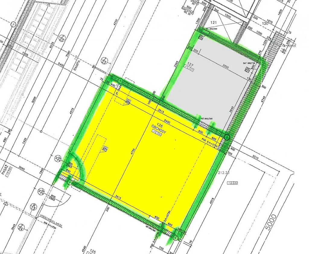 Prostory mají velké výkladce do pasáže a dále 2 velké výkladce do ulice Benešova o velikosti 3,36 x 2,40m a 1,75 x 3,36 m