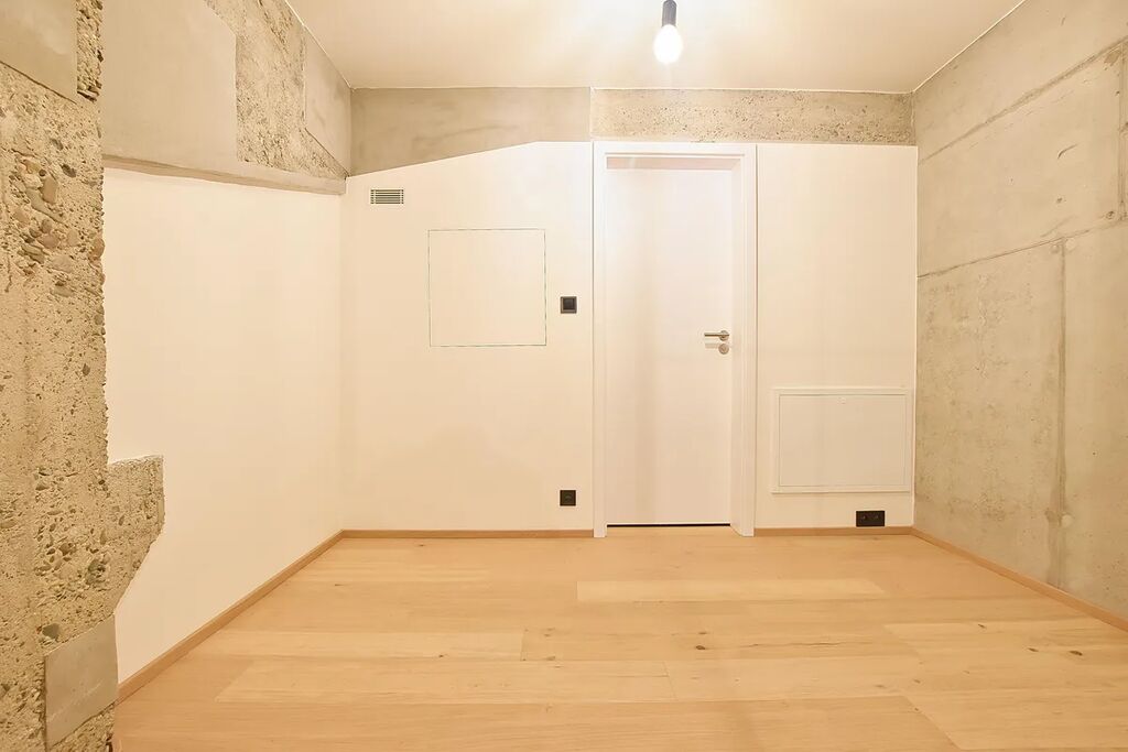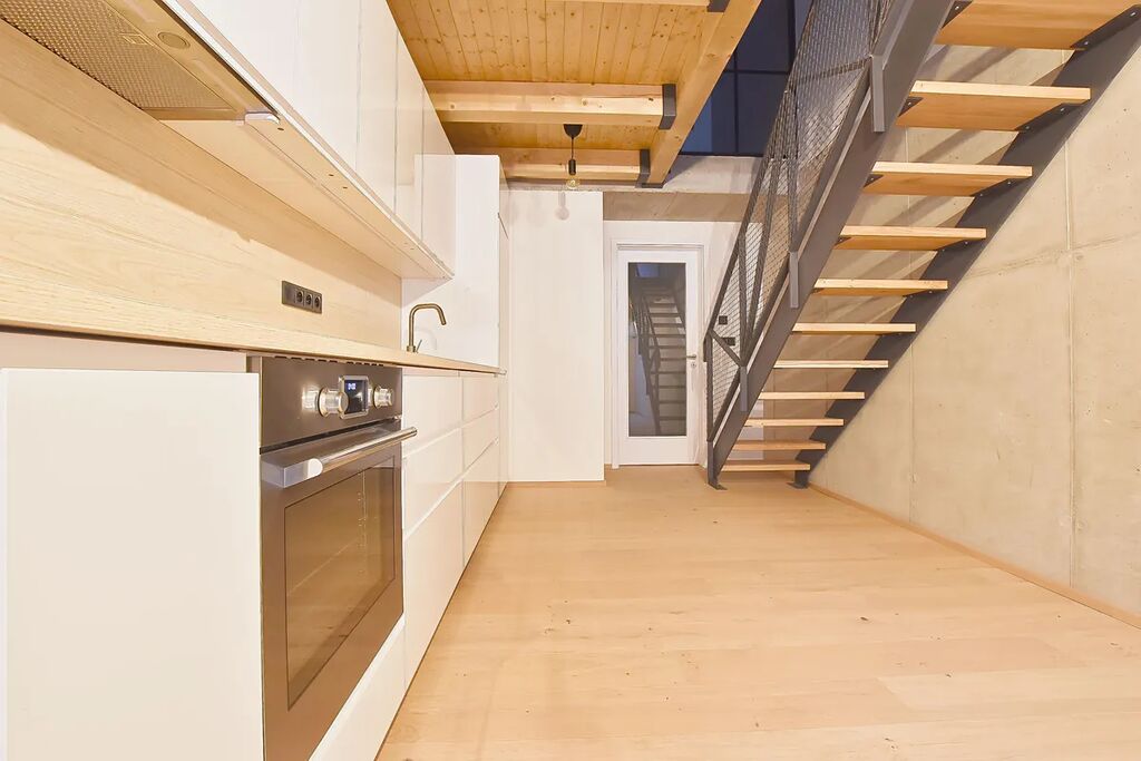 Dominantou bytu je prosklená ložnice v patře, do které vede stylové schodiště. Vedle ložnice se nachází pracovna, která je ideální pro homeoffice či relaxační zónu. V horním patře je rovněž samostatná toaleta, zatímco v dolní části bytu se nachází koupelna se sprchovým koutem a druhou toaletou, což výrazně zvyšuje komfort každodenního užívání.