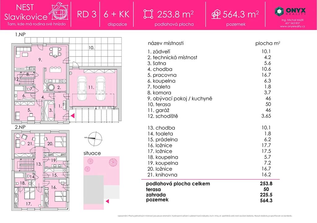 Celková užitná plocha domu činí 253,8 m². Součástí nabídky je terasa ze sibiřského modřínu o velikosti 50 m² a na ni navazující zahrada o výměře 227,2 m². Pozemek má celkovou rozlohu 564 m².