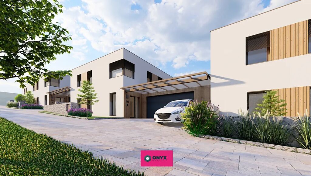 Nabízíme ke koupi velký moderní, nízkoenergetický - ve Třídě A - rodinný dům se dvěma plnohodnotnými podlažími, rovnou střechou a propracovaným dispozičním řešením. Dům disponuje šesti obytnými místnostmi, velkým obytným prostorem (obývací pokoj s kuchyní o velikosti 46 m² s prosklenou stěnou do "L" s přímým vstupem na terasu s HS portálem), třemi koupelnami, třemi toaletami a dvougaráží. Praktickým bonusem je samostatná prádelna s velkým francouzským oknem.