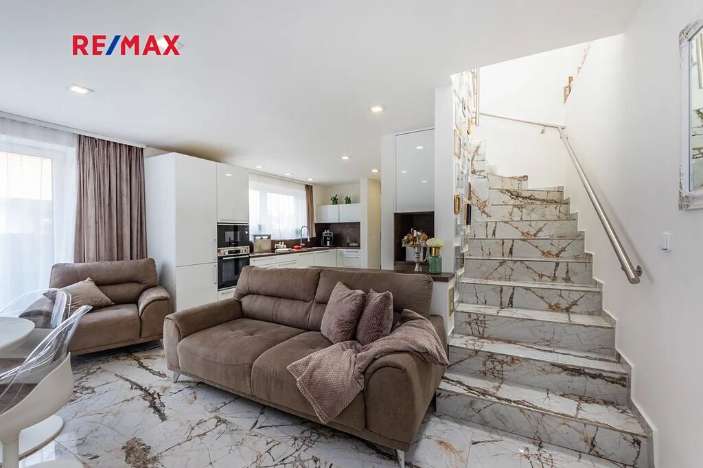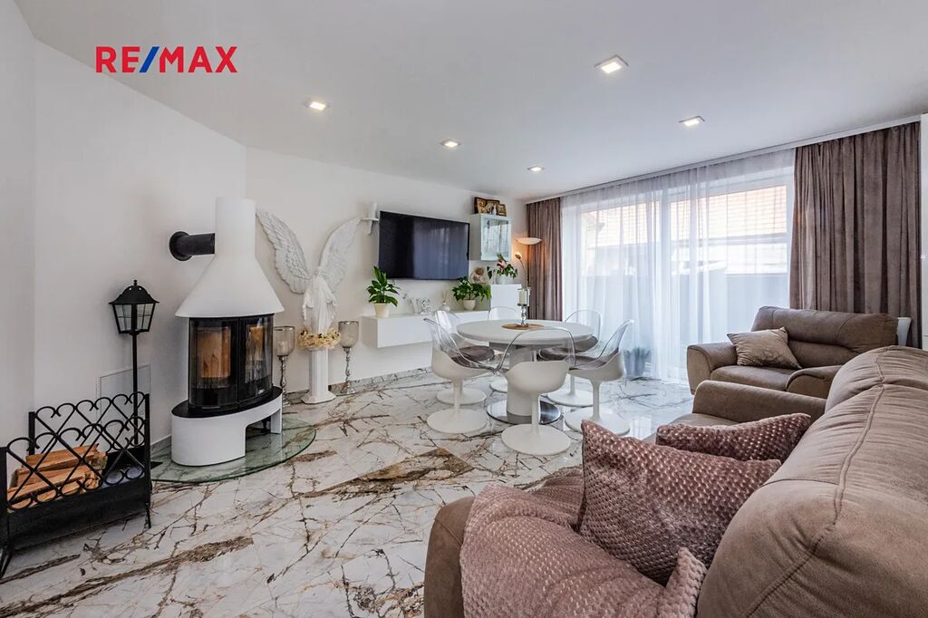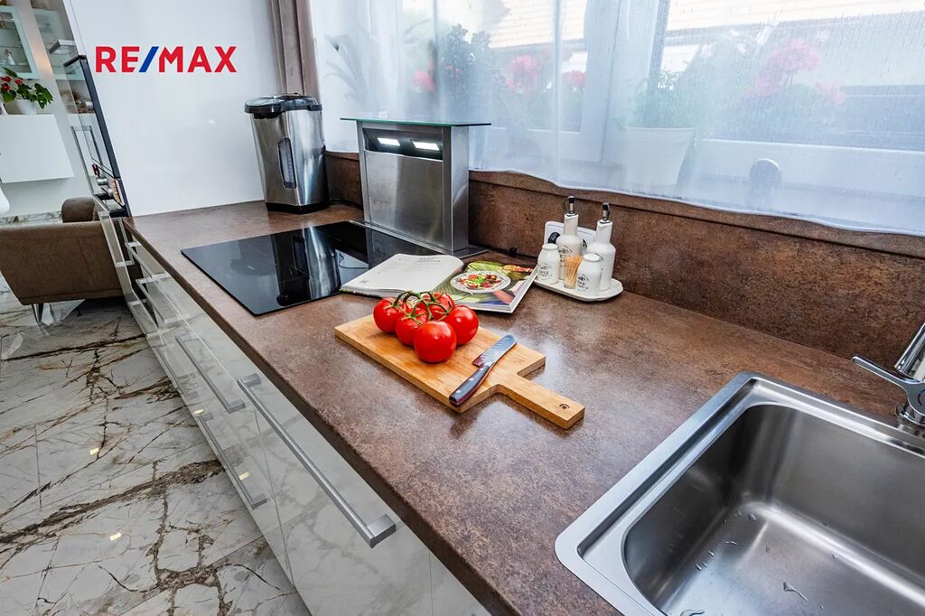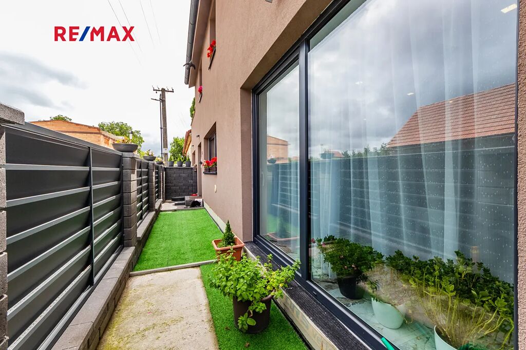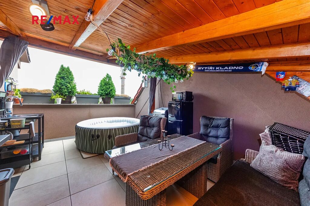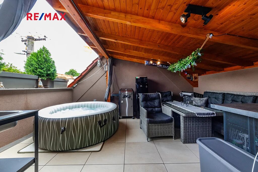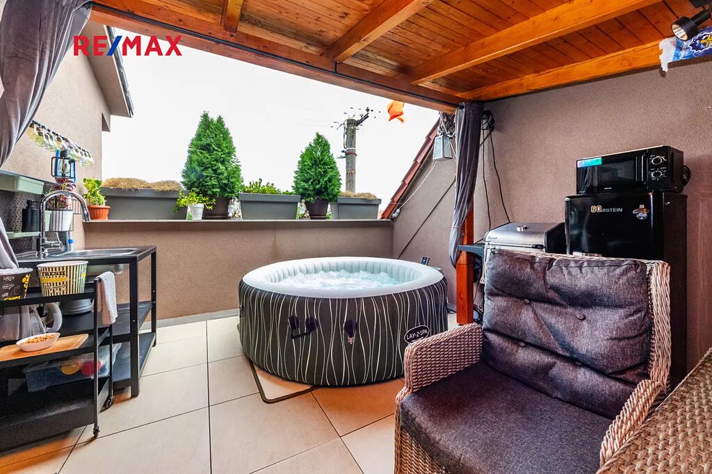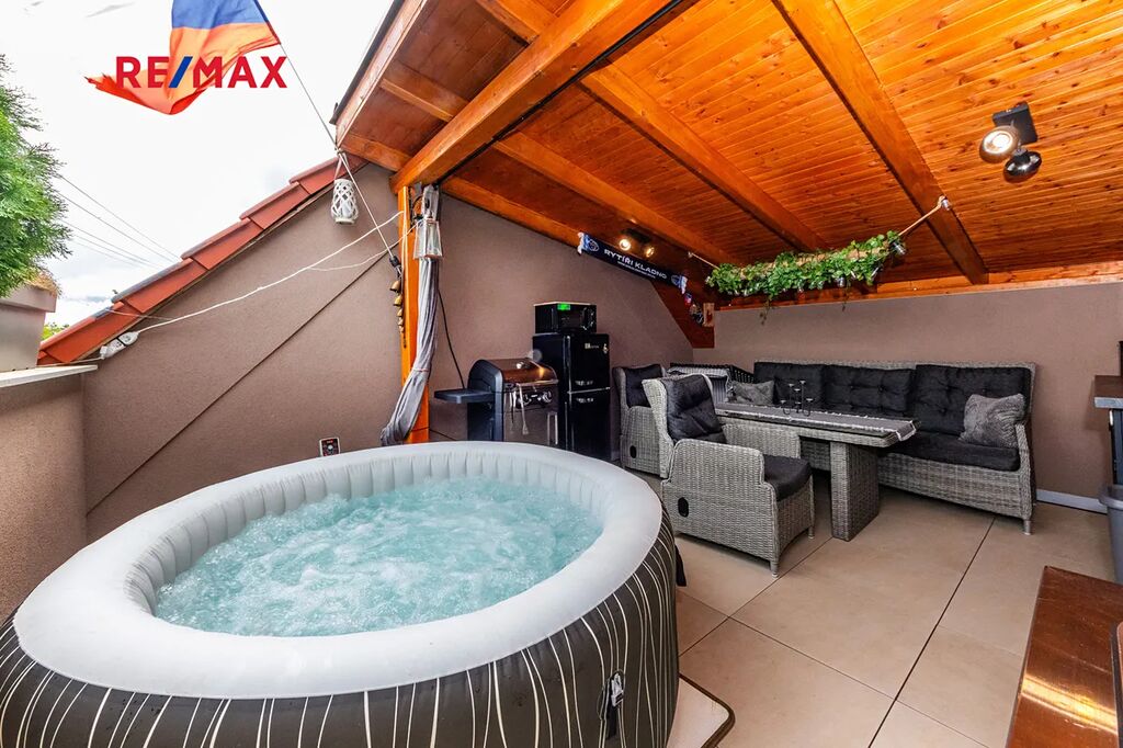 Terasa je jedním z hlavních benefitů této nemovitosti. Díky zastřešení ji lze využívat za každého počasí. V současnosti je zde umístěna vířivka a pohodlné venkovní posezení – ideální místo pro relaxaci nebo letní grilování s rodinou a přáteli.