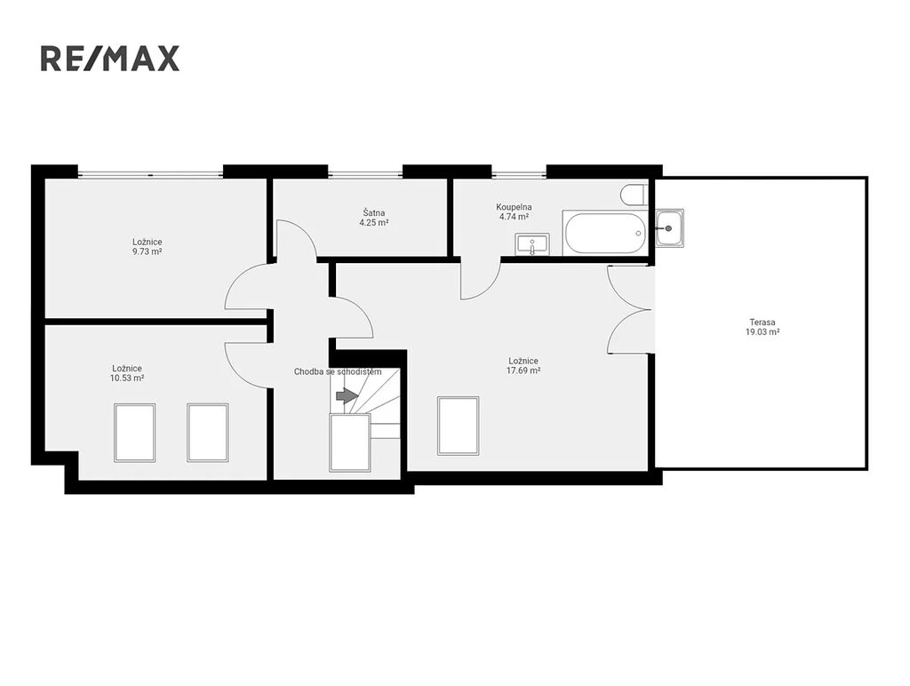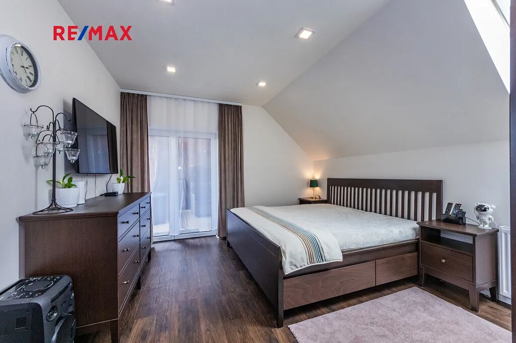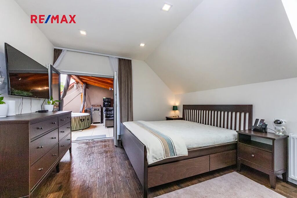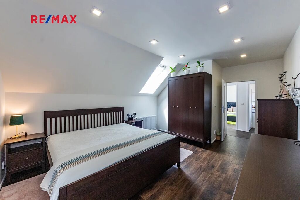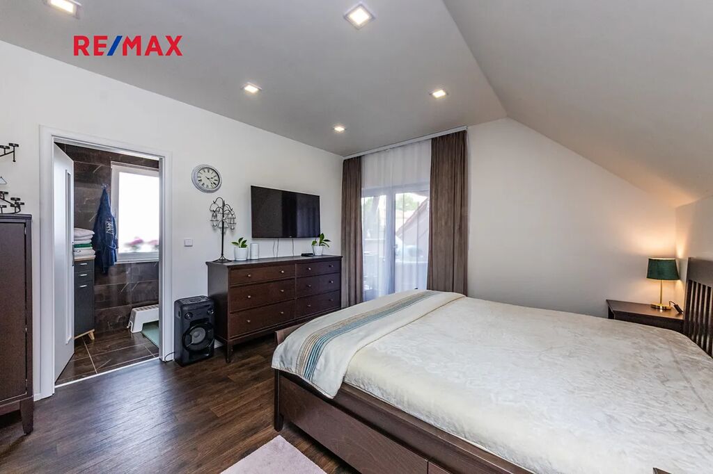V patře domu se nachází klidová zóna. Jsou zde dva menší pokoje, ideální jako dětské ložnice, pracovna nebo pokoj pro hosty. Dále šatna a velkorysá hlavní ložnice, která poskytuje dostatek prostoru a pohodlí. Součástí této ložnice je vlastní koupelna, která zajišťuje naprosté soukromí a komfort. Z ložnice je zároveň přímý vstup na prostornou krytou terasu.