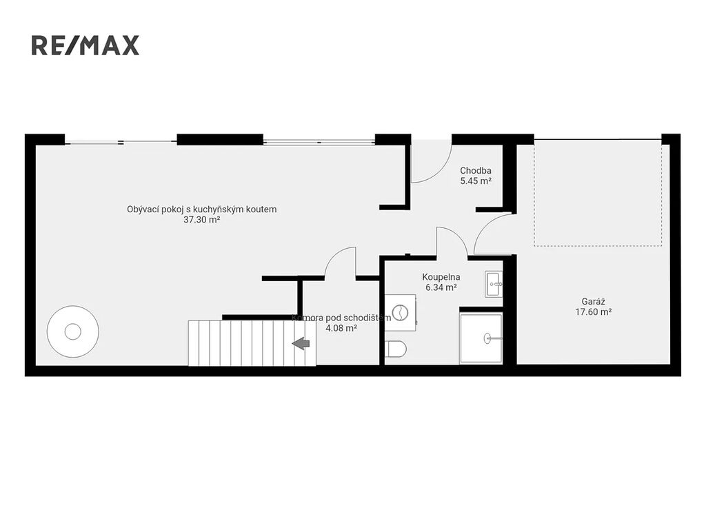 Přízemí domu je navrženo tak, aby maximálně usnadňovalo každodenní provoz domácnosti. Součástí je prostorná garáž s přímým vstupem do interiéru, což je velmi praktické především v chladných nebo deštivých měsících. V garáži se nachází technické zázemí domu, včetně veškerých potřebných instalací. Dále je v přízemí velký obývací pokoj s kuchyňským koutem, který tvoří centrální společenský prostor domu. Kuchyně je moderní a prakticky řešená, s dostatkem úložného prostoru i pracovních ploch a je zde také praktická spíž. V chodbě se nachází samostatná koupelna s toaletou. Z obývacího pokoje vedou schody do horního patra.