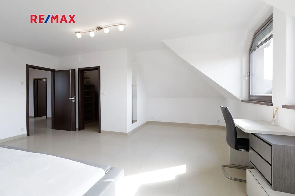 Při stoupání do prvního patra se nám nabídne prostorná chodba se vstupy do 3 ložnic, z nichž jedna z nich lze rozdělit na dva samostatné pokoje. Součástí každé ložnice je šatna s úložným prostorem. V prvním patře najdeme další koupelnu, tentokrát s vanou i se sprchovým koutem, dále pak samostatné WC.