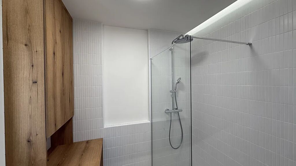 Nic nebylo ponecháno náhodě ani v nové koupelně s úložnými prostory, zabudovaným místem na pračku, velkým sprchovým "walk in" koutem, nerezovým otopným žebříkem a zabudovaným nepřímým osvětlením v nikách, podsvětleným zrcadlem a místem i na dlaší zrcadlo něbo poločky. Sušičku prádla je pak možno umístit na vstupní chodbu.