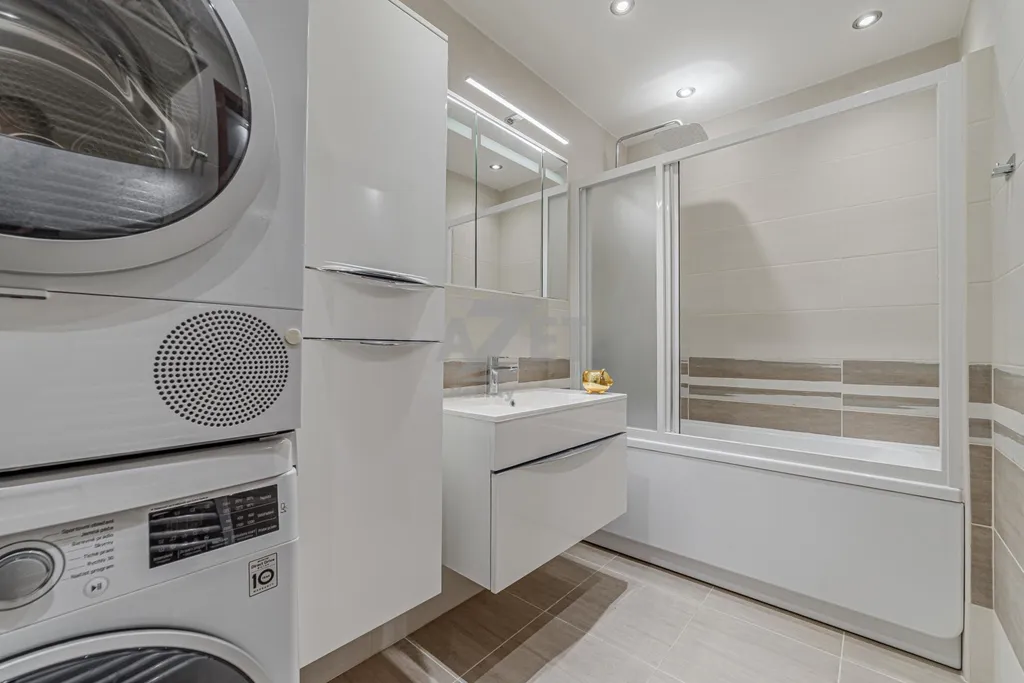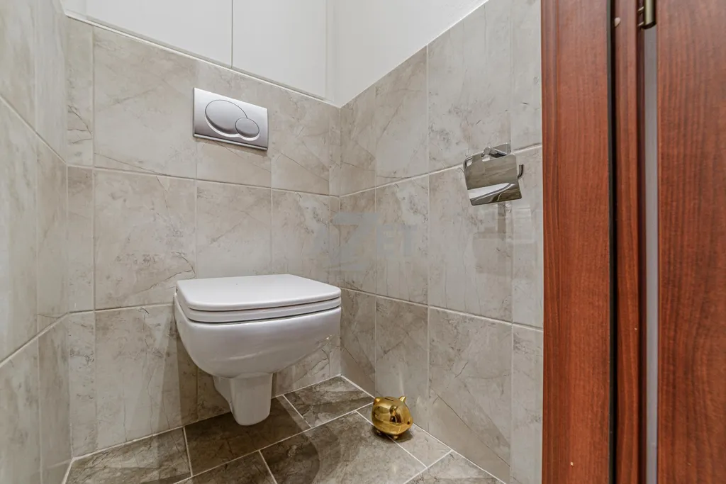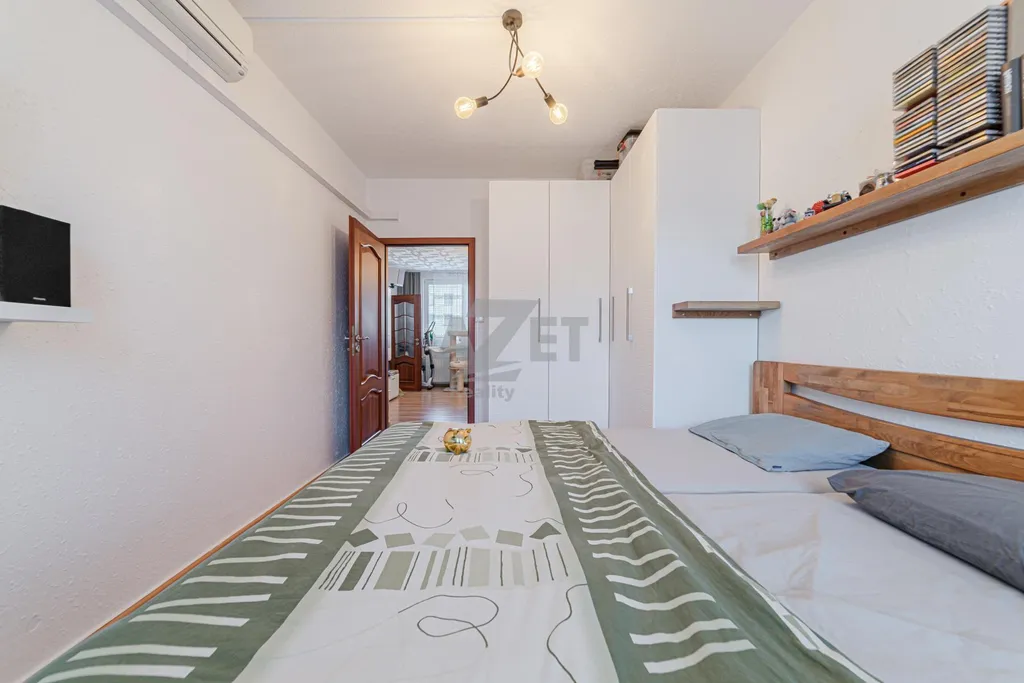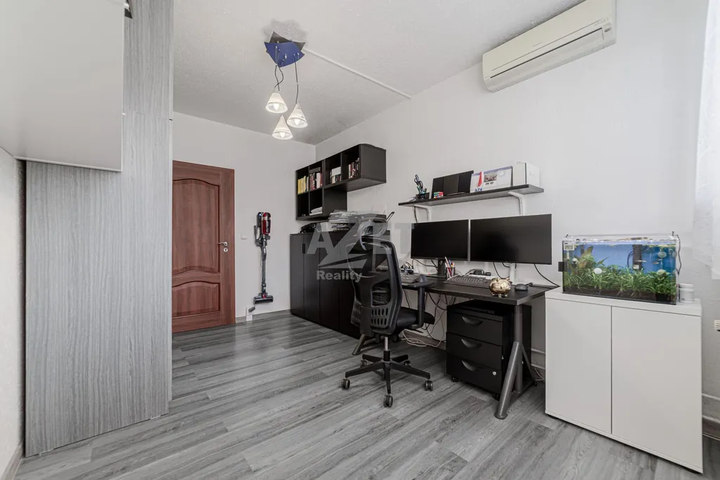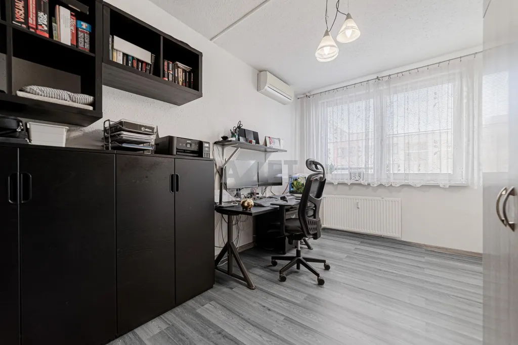 Umístění bytu je v 5. nadzemním podlaží (4. patro) z osmi. Vstup do bytu je zabezpečen bezpečnostními dveřmi značky SHERLOCK. Jednotlivé místnosti jsou neprůchozí, vyjma obývacího pokoje. Kuchyňská linka je rohová s vestavnými spotřebiči kompletně na míru dělaná potřebám a požadavkům majitele s použitím nadstandardních materiálů. Lednice je zabudovaná do konceptu kuchyňské linky a taktéž je součástí prodeje. Ložnice navazující na zasklenou lodžii je dostatečně velká nejen pro manželkou postel, ale také pro šatní skříň. Útulný dětský pokoj nyní sloužící jako pracovna do které je vstup přes malou chodu s vestavěnými skříněmi poskytující velký úložný prostor. Koupelna, která je díky promyšlené rekonstrukci nadstandardně velká pro umístění pračky se sušičkou a klasické vany se sprchovou zástěnou. Toto praktické řešení vany jistě ocení každý rodič jehož dítko miluje hraní si ve vaně bez rizika vyplavení bytu. WC je samostatné. Jistě je velkým benefitem klimatizace v obývacím pokoji, ložnici a pracovně. K bytu náleží standardní sklepní kóje. Nynější měsíční předpis plateb za byt činí 5.129 Kč.