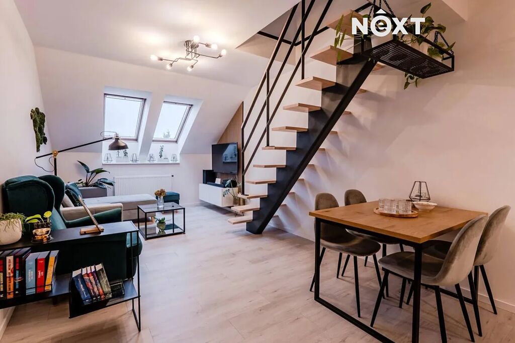 V bytě je k dispozici předsíň (5,4 m2), ze které je vstup do koupelny (4,5 m2) se sprchou, umyvadlem, toaletou a do obývacího pokoje (19,6 m2) s kuchyňským koutem (6,5 m2). Ranní kávu si za teplých dní můžete vychutnat v lodžii (4,8 m2) navazující na ložnici (12,2 m2) přístupnou z obývacího pokoje. Z obývacího pokoje se doslova vznáší jednoramenné schodiště do podkrovního pokoje (23,5 m2). Ústřední vytápění bytu a ohřev TUV zajišťuje vlastní zánovní kotel na zemní plyn . Bonusem tohoto bytu je i instalovaná klimatizace.