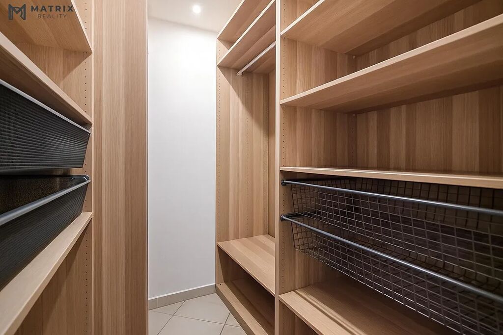 The apartment is oriented to the south and west, providing plenty of natural light throughout the day. It features two balconies (8 m and 4 m), a garage parking space, a walk-in closet, and a cellar storage unit.