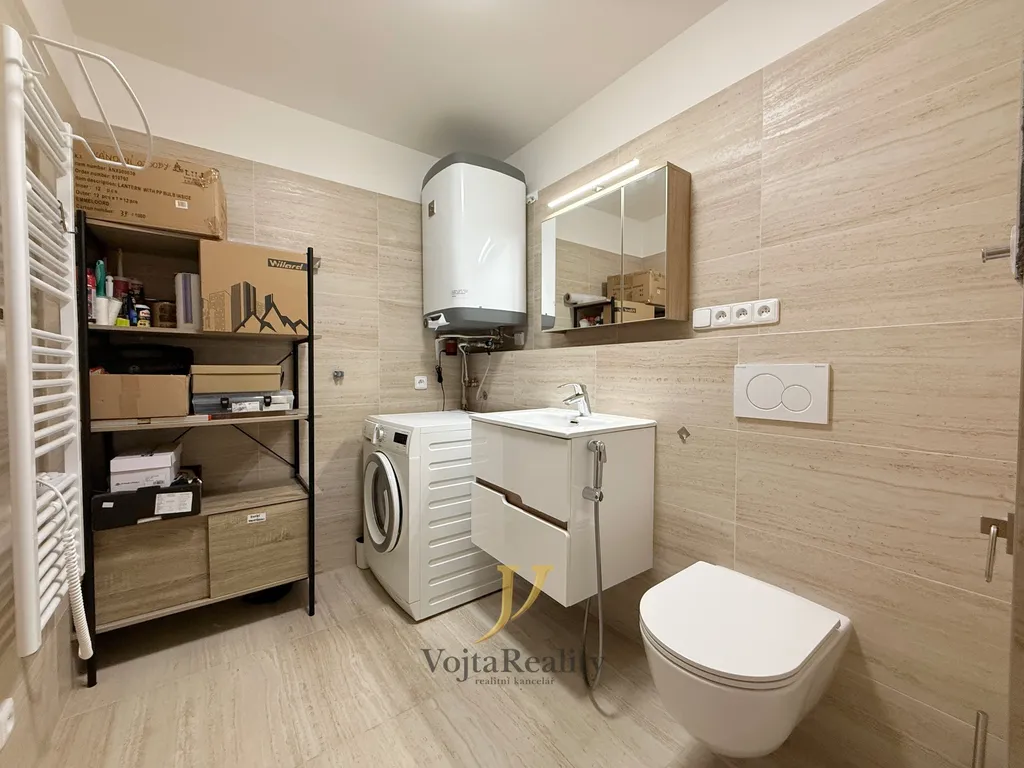 Ze vstupní chodby je přístup na samostatnou toaletu s bidetovou sprškou, umyvadlovou skříňkou, pračkou a elektrickým bojlerem. Dále posuvnými dveřmi vstup do světlého obývacího pokoje s kuchyňským koutem a vstupem na balkon s výhledem do přírody.