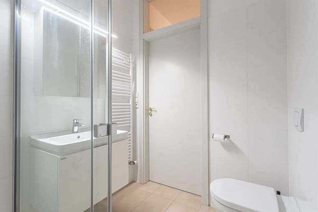 Interiér bytu je nezařízený (možnost vybavení nábytkem za vyšší nájem dle domluvy). Dispozičně prostor nabízí vstupní chodbu, prostorný, světlý obývací pokoj s vybavenou kuchyní s vestavěnými spotřebiči (lednice s mrazákem, varná deska, trouba, myčka), 2 samostatné prostorné ložnice, 2 koupelny jedna s vanou a toaletou a druha se sprchovým koutem a toaletou. V bytě je dále komora s pračkou a k bytu náleží také sklep.