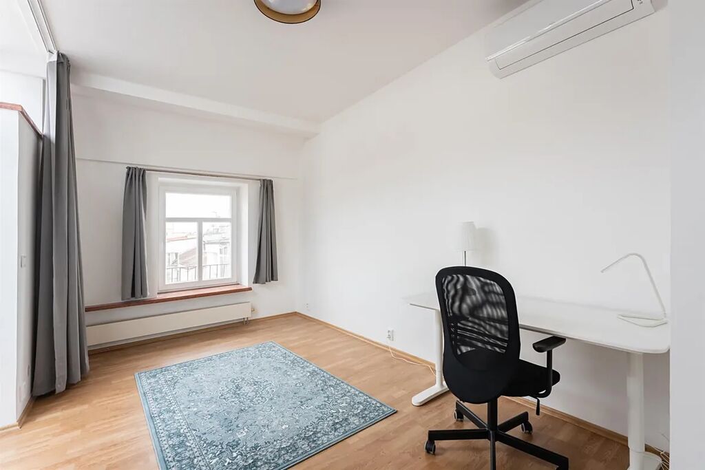 Luxusní prostorný mezonet s terasou a zimní zahradou, 5+kk (4 ložnice, 3 koupelny) o celkové rozloze 248 m2 je situovaný v 6. a 7. patře rezidenčního domu s výtahem. Byt nabízí obývací pokoj s plně vybavenou kuchyní (sporák/trouba, lednice, myčka) oddělenou skleněnou příčkou, 4 ložnice situované do klidné zóny vnitrobloku, 3 koupelny (sprcha, vana, bidet), 2x šatnu, komoru a prádelnu. Byt je vybaven nábytkem. Terasa a zimní zahrada jsou situované na jižní stranu. Nádherný výhled na Hradčany. SAT, telefonní linka a internet.