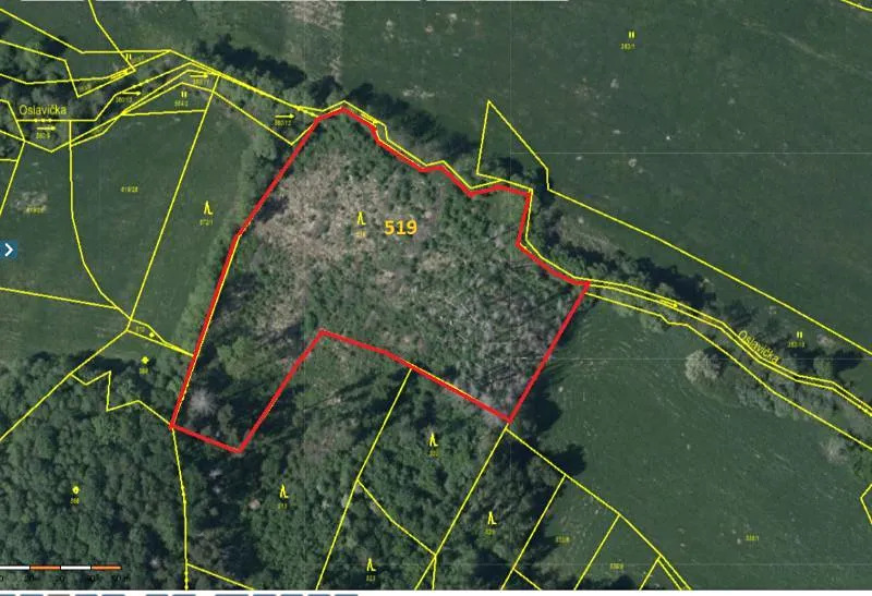 Lesní pozemek nepravidelného tvaru, nacházející se mezi zemědělskými pozemky a privátními lesy, přístupný přes zemědělské pozemky. Lesní porost byl zcela vytěžen – nezalesněná holina.