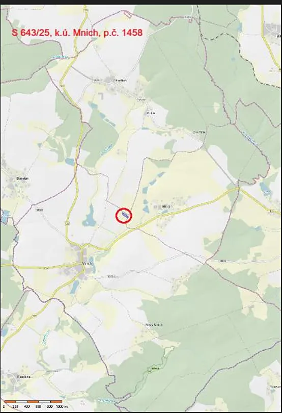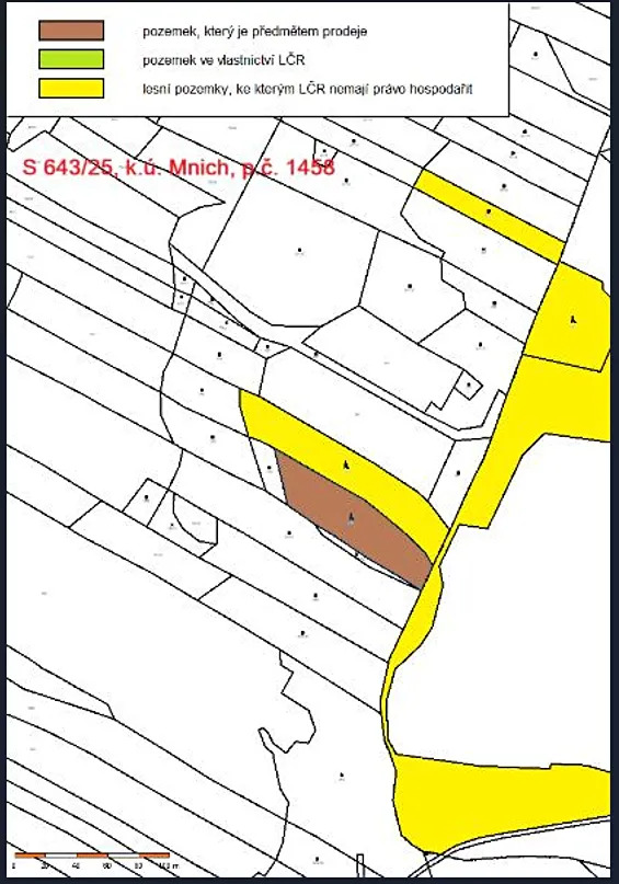 Jedná se o prodej lesního pozemku parc. č. 1458 o výměře 3111 m2, nepravidelného tvaru, dobře přístupného, obklopeného převážně zemědělskými pozemky jiných vlastníků, ze severní a severozápadní strany navazujícího na drobný les rovněž jiného vlastníka. Na pozemku roste mladý i vzrostlý smrk, několik borovic a listnatých stromů.