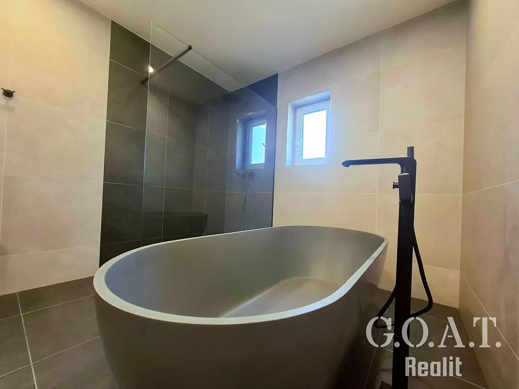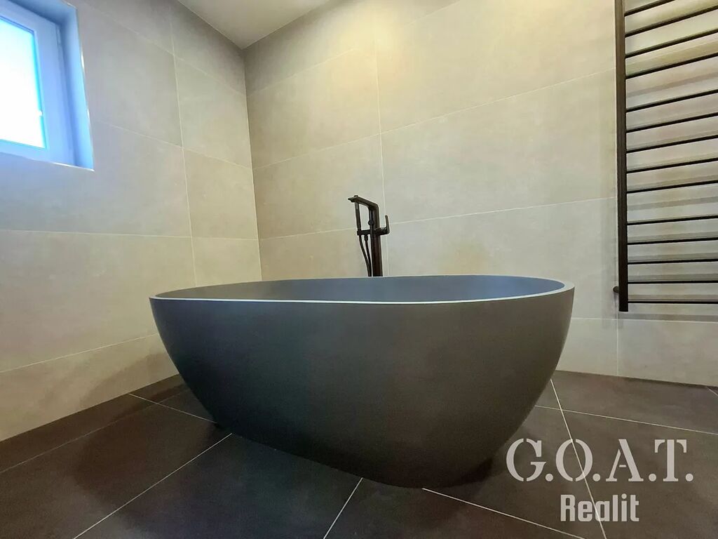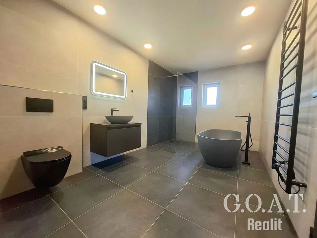 Koupelna nabízí sprchový kout i volně stojící vanu. Dispozice dále zahrnuje ložnici (18 m²), dva prostorné pokoje (25 m² a 22 m²), technickou místnost, chodbu a zádveří.