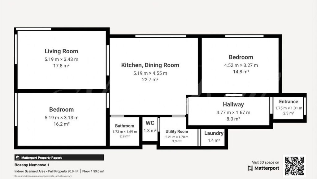 Byt je situován v přízemí s vlastním vstupem ze zahrady a nabízí velkorysý obývací pokoj s kuchyní a přímým výstupem na terasu, tři ložnice s přístupy na zahradu, koupelnu, technickou místnost, samostatné WC a šatnu. Celková podlahová plocha je 90 m², zahrada pak poskytuje ideální prostor pro odpočinek či rodinné aktivity.
