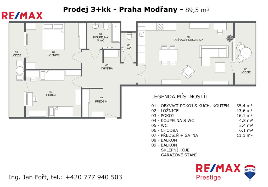 Nabízíme prodej bytu 3+kk o celkové podlahové ploše 93,8 m², umístěného v posledním – 5. nadzemním podlaží projektu Neo Riviera / Rezidence Modřanka. Součástí bytu jsou dva balkony, garážové stání v podzemním podlaží a sklepní kóje. Budova má energetickou třídu B.