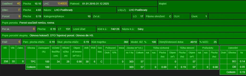- p.č. 712/9 vedená jako lesní pozemek o celkové výměře 1 918 m2 (stáří lesa 64 let - zastoupení dřevin topol černý)