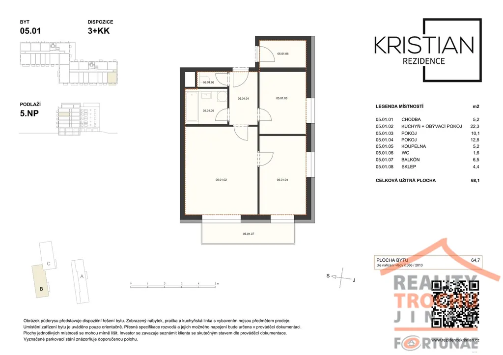 V novém developerském projektu Rezidence Kristian nabízíme prodej, moderního a nízkoenergetického bydlení v bytu 3+kk s balkónem a vnitřním parkovacím stáním ve vyhledávané lokalitě v Hradci Králové – Moravské Předměstí. Bytová jednotka se nachází v 5. NP zděného bytového domu, celková užitná plocha 68,1 m2, 1x balkón (6,5 m2), sklep 4,4 m2. Dispozice: vstupní chodba, obývací pokoj s kuchyňským koutem, jídelnou, ložnicí, pokojem, koupelna, WC. Vytápění: ústřední dálkové. K bytu náleží 1x vnitřní parkovací stání. Ve standardním provedení: plastová okna hranatá s izolačním trojsklem, vinylové podlahy KPP – výběr z 12 typů dekorů, koupelna s keramickou dlažbou La Ceramica Factory – výběr ze 4 dekorů, obklady Rako Systém, umyvadlo keramické se stojánkovou pákovou baterií, vana bílá akrylátová obdélníková. WC závěsné bílé. Použité materiály kombinují moderní technologie a udržitelnost a především snižují energetické náklady.