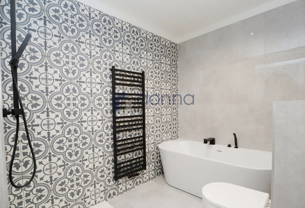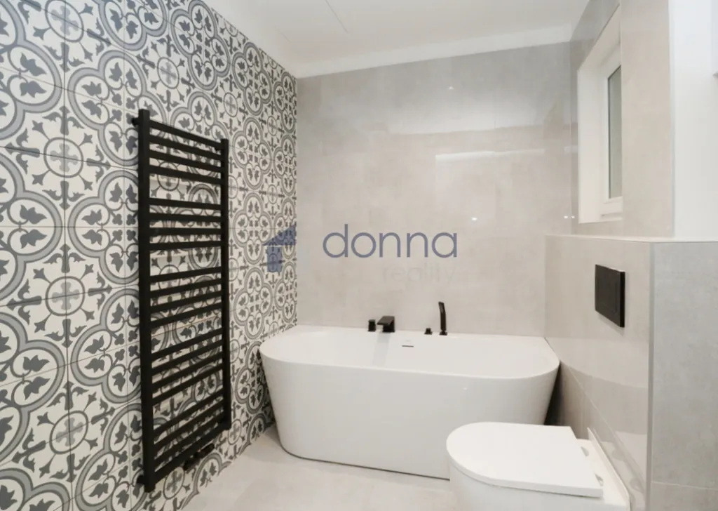 V koupelně je vana, sprchový kout a toaleta. Šatna. Podlahy: vinyl a dlažba. Vytápění i voda: plynový kotel.