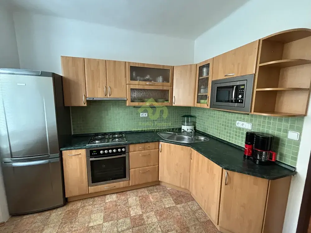 Byt má plastová okna vč. žaluzií a je nabízen s. vybavením, které je patrné na fotografiích. V prostorné kuchyni je k dispozici kuch.linka zbudovaná na míru do tvaru „L“ včetně spotřebičů – plynového sporáku s troubou, digestoří, dřezem, mikrovlnou troubou, lednicí s mrazákem a kávovaru a ostatního kuch. vybavení. Dále má byt 2 průchozí pokoje, v krajním pokoji se nachází ložnice, pokoj přilehlý ke kuchyni je využíván jako obývací. Ve vstupní chodbě bytu je komora a ze druhé komory byla zbudované šatna přístupná z obývacího pokoje. Dále má byt koupelnu s rohovou vanou a umyvadlem, toaleta je samostatná.