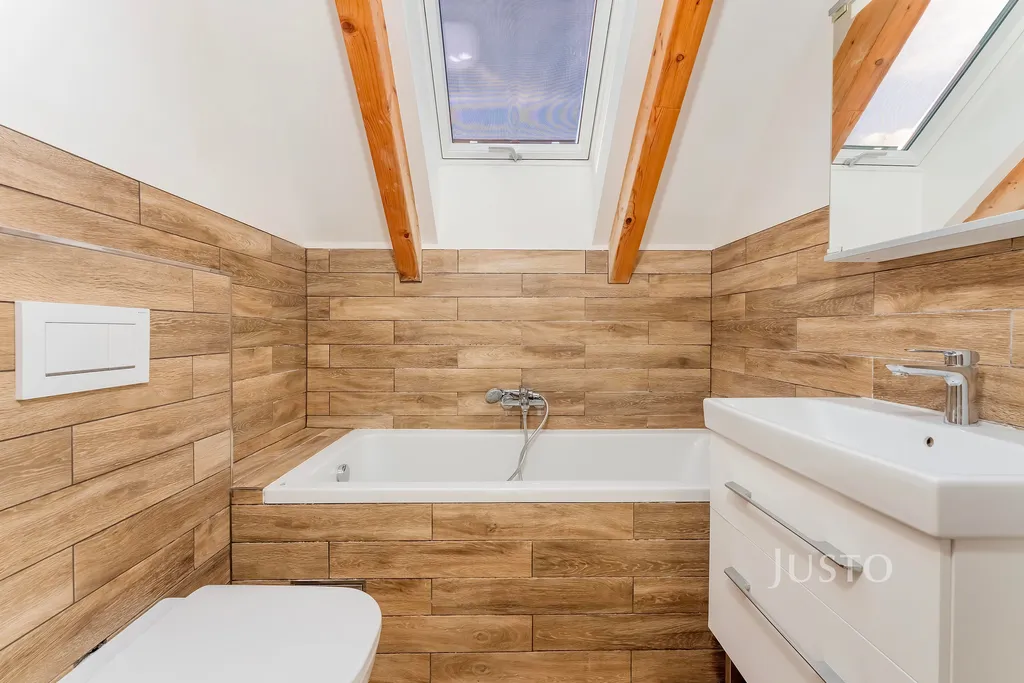 - betonovým schodištěm se dostaneme do 2.NP kde je koupelna s vanou a WC a dva pokoje, užitná plocha 2.NP je 32,71 m².