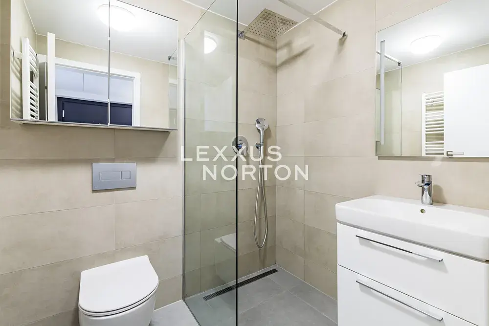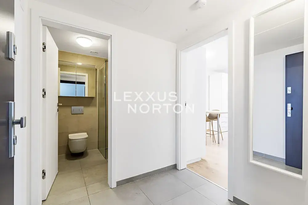 Součástí vybavení je jídelní barový stůl se dvěma židlemi, pohovka, konferenční stolek a prostorná vestavěná skříň s dostatkem úložných prostor. Kuchyňská linka je vybavena lednicí, dvouplotýnkovou varnou deskou a troubou. Koupelna nabízí walk-in sprchový kout a toaletu. V bytě je k dispozici také pračka.