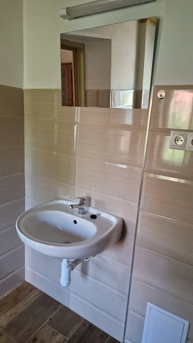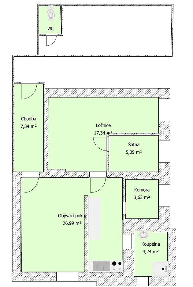 Byt je vytápěn kombinací krbových kamen a elektrických přímotopů a je zařízen kuchyňskou linkou se základními spotřebiči.
