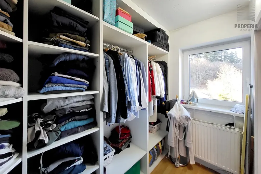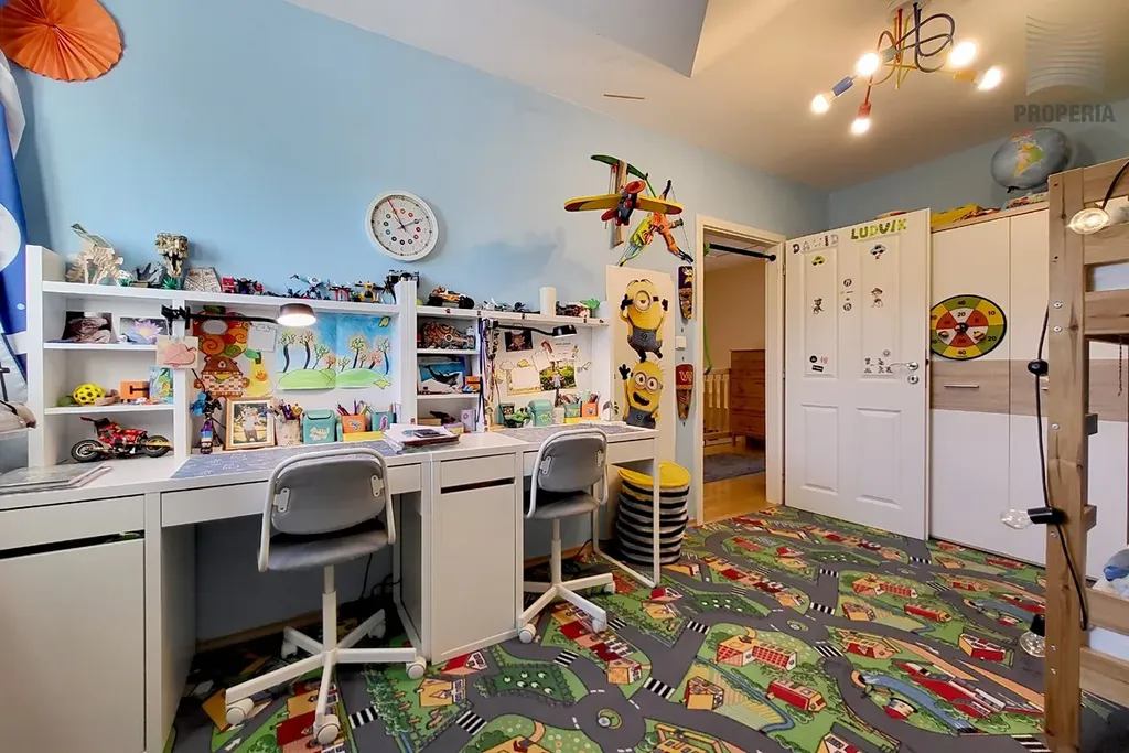 V patře pak naleznete dětský pokoj, ložnici s velkou šatnou, koupelnu s WC, vanou i sprchovým koutem. Z ústřední haly můžete vstoupit na půdu, vhodnou jako hrací, nebo úložný prostor.