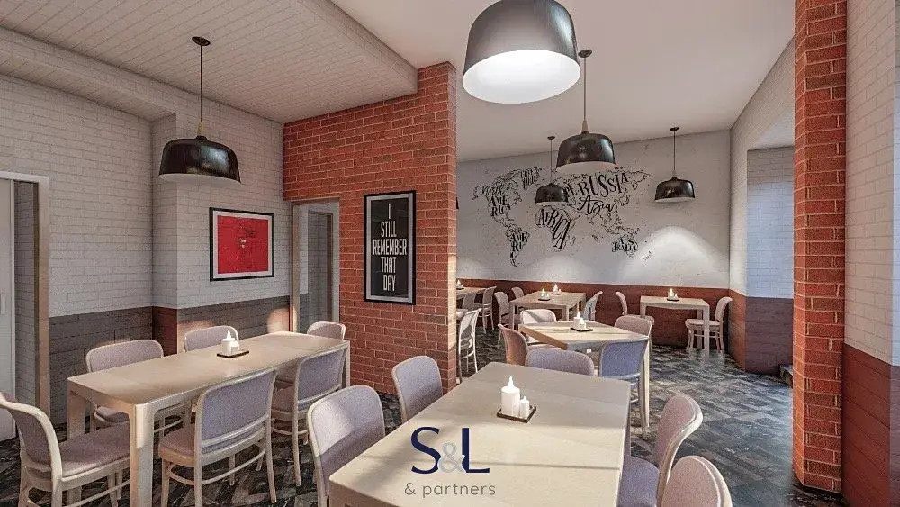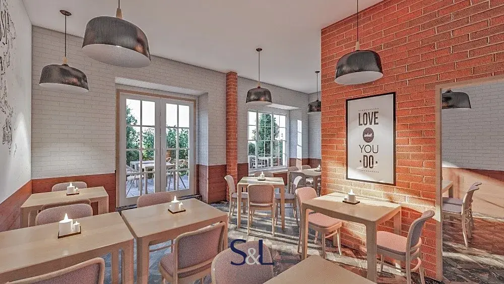 - Suterén (1. PP): hlavní sál s klenutými stropy, ideální pro klubový prostor, menší sál vhodný pro další zázemí nebo oddělenou místnost, sklady, technická místnost s kotelnou a další prostory pro provozní zázemí.