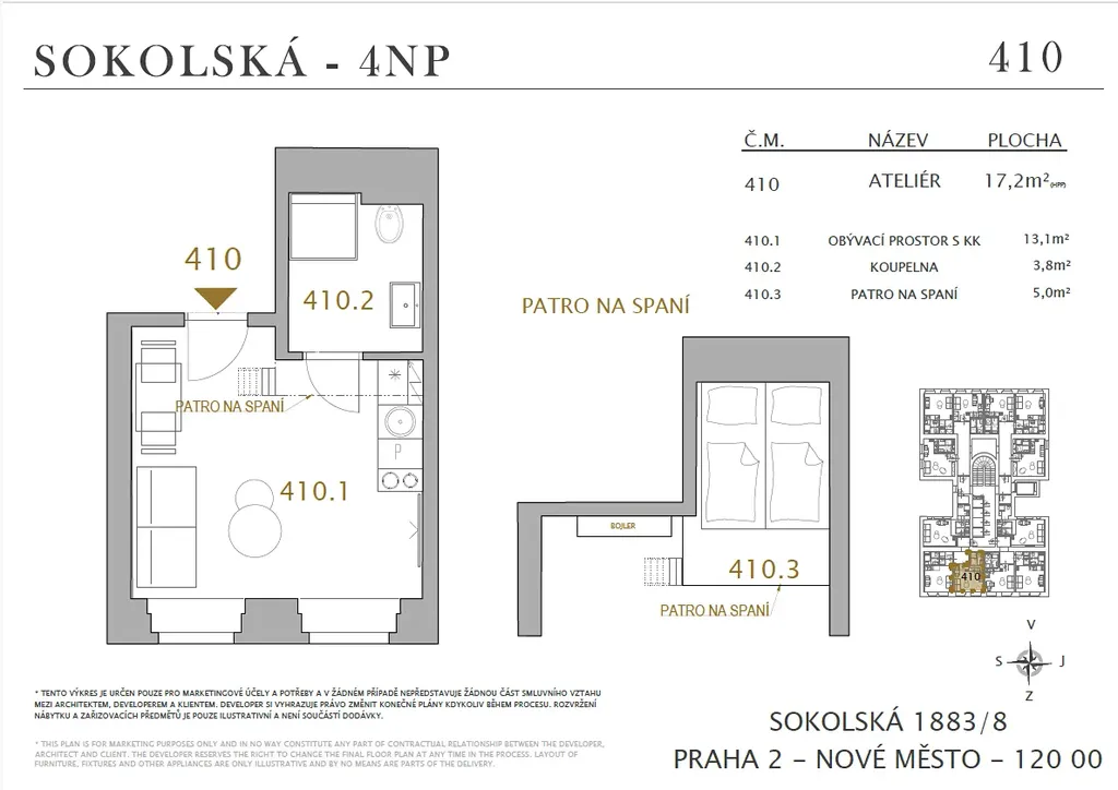 Byt o celkové ploše 22 m² (obytná část 17,2 m² + patro na spaní 5 m²) se nachází ve 4. patře udržovaného činžovního domu po rekonstrukci s výtahem. Součástí nájmu je také sklepní kóje.