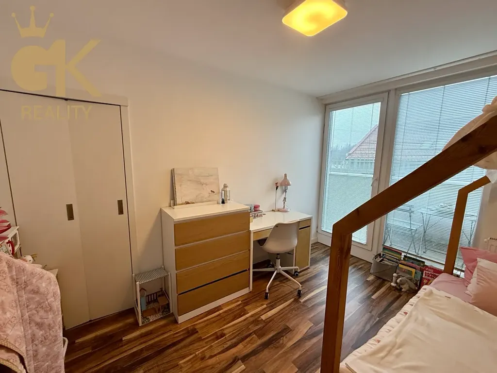 Druhý pokoj s francouzskými okny o rozloze 16 m² má stavebně oddělenou šatnu. Třetí pokoj se střešním oknem o velikosti 6,45 m² lze využít jako menší, avšak plnohodnotný pokoj. Byt disponuje velkou koupelnou se střešním oknem, pračkou a nábytkem na míru.