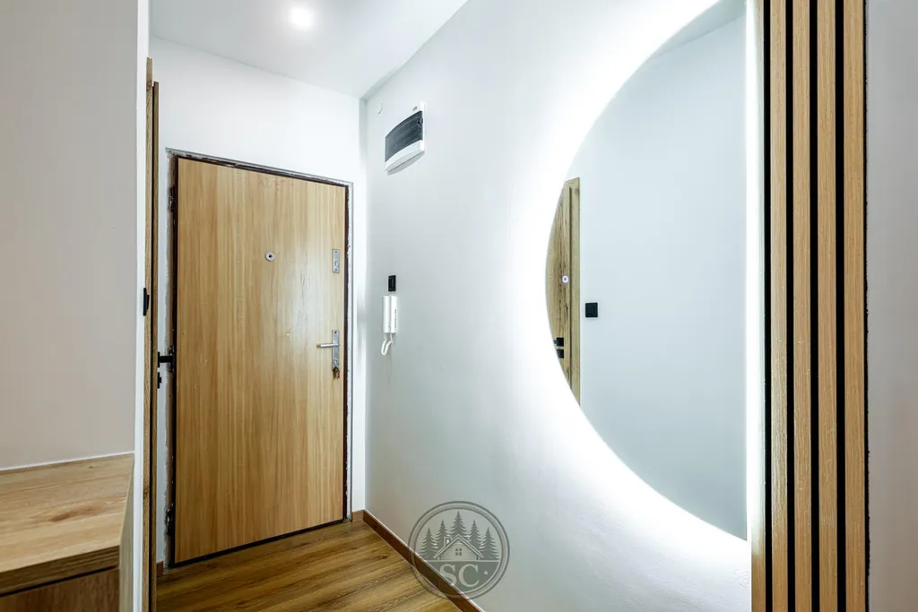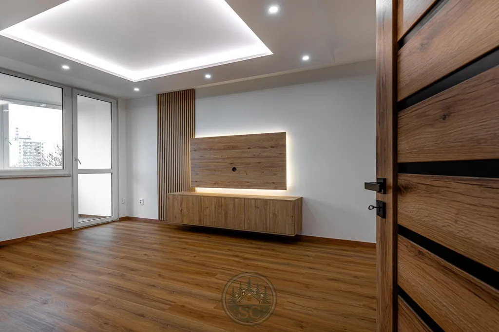 Kvalita rekonstrukce je vidět na první pohled - celý byt má nově vyrovnanou podlahu pomocí nivelace a položenou kvalitní vinylovou krytinu, vyměněny byly všechny dveře včetně zárubní a prostor působí moderně a velmi čistě už při vstupu. Obývací pokoj se zasklenou lodžií nabízí moderní obývací stěnu s přípravou na TV, doplněnou podsvícením s možností regulace intenzity pomocí ovladače. Osvětlení obývacího pokoje bodovými svítidly umožňuje přepínat mezi teplým a studeným tónem světla, což platí také pro druhý pokoj. V pokojích jsou instalovány moderní dotykové vypínače, které umocňují nadčasový styl rekonstrukce.