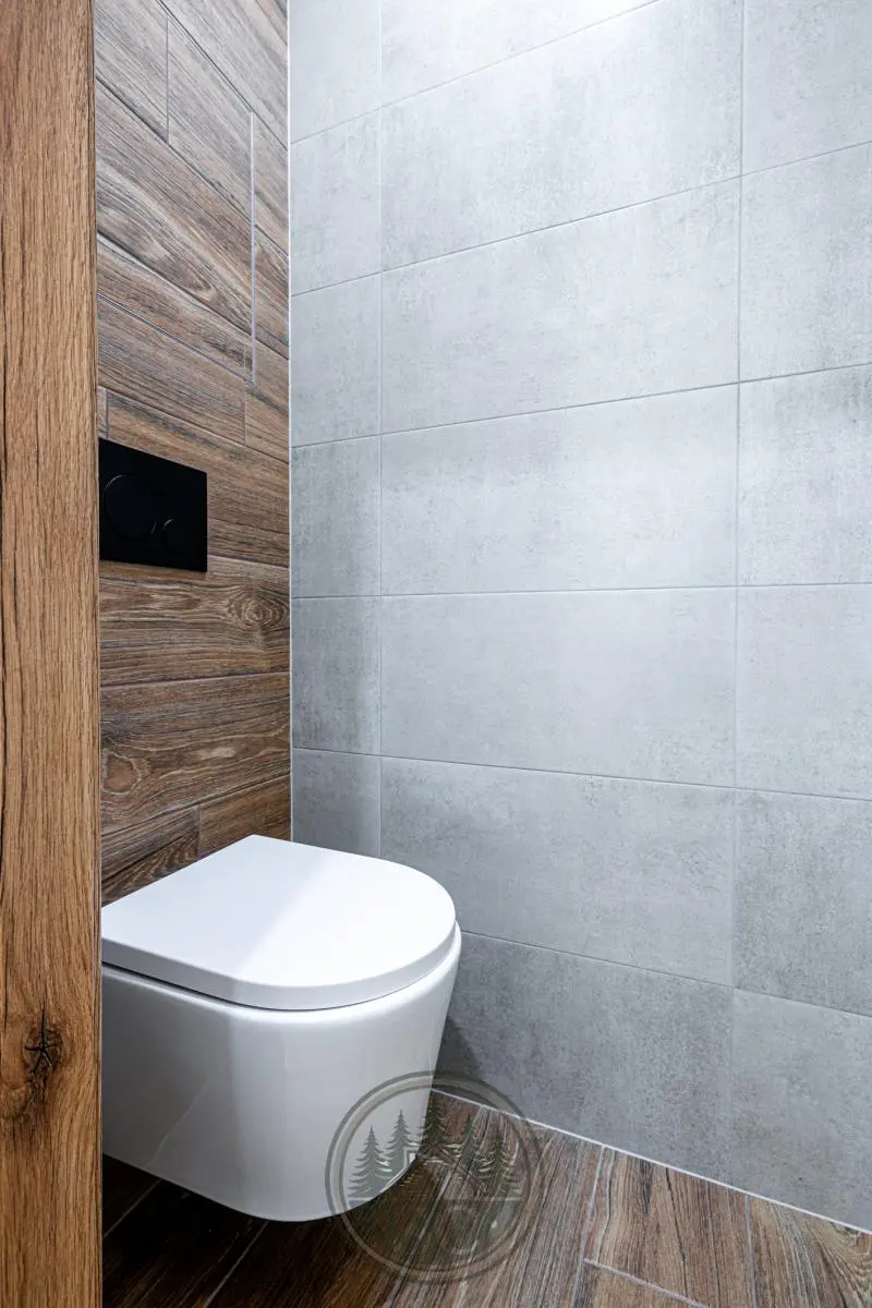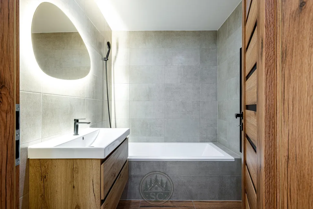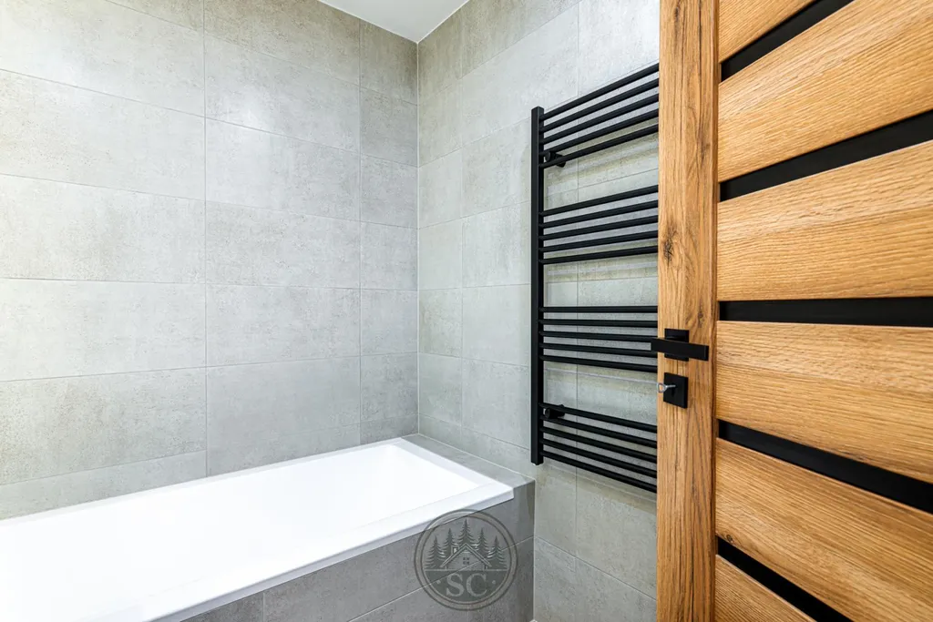 Zasklená lodžie má položenou dlažbu v dekoru dřeva a poskytuje další příjemný prostor k posezení. Koupelna je laděna do kombinace šedých obkladů a dlažby v dekoru dřeva, vybavená vanou, velkým umyvadlem se skříňkou, podsvíceným zrcadlem a připraveným prostorem pro pračku a sušičku. WC je samostatné, ve stejném designu, osazené závěsným systémem Geberit. Koupelnu a toaletu odděluje předsíň s elegantním podsvíceným zrcadlem.