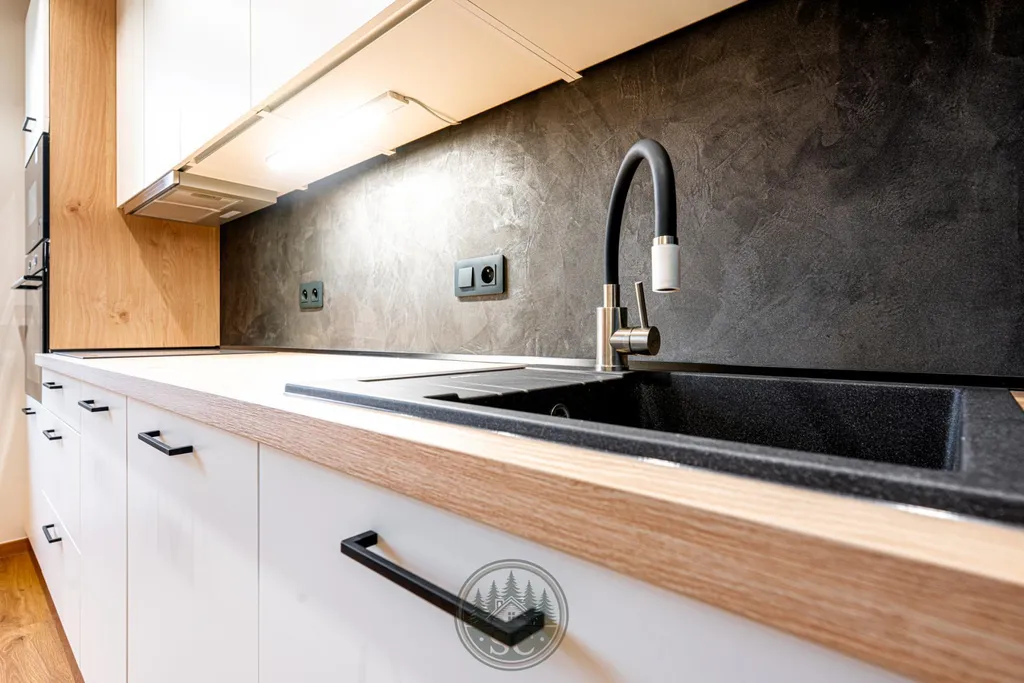 Hned po vstupu do bytu vaši pozornost upoutá nádherná kuchyně, která je skutečným srdcem celého domova. Dominantou prostoru je jídelní stůl z masivu se židlemi, kolem kterého je navržena elegantní kuchyňská linka na míru. Kuchyně je vybavena indukční varnou deskou, vestavnou troubou, mikrovlnnou troubou, myčkou a volně stojící lednicí, takže nabízí plnohodnotný komfort i moderní vzhled. Součástí kuchyně je také stylová komoda s integrovanou vinotékou, nad kterou je umístěn dřevěný dekor s podsvícenou lamelou. Tento prvek vytváří večer krásné ambientní osvětlení. Nad jídelním koutem jsou instalována designová světla navržená tak, aby neoslňovala, a před kuchyňskou linkou jsou samostatná stropní světla pro perfektní viditelnost při vaření.