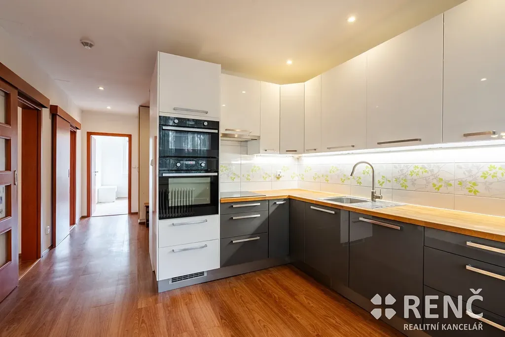 Kuchyně je vybavena moderní kuchyňskou linkou zn. Ikea s elektrickou varnou deskou, elektrickou troubou, mikrovlnnou troubou, myčkou, spížní skříní a lednicí s mrazákem. V předsíni jsou instalovány dvě prostorné vestavěné šatní skříně a botník.