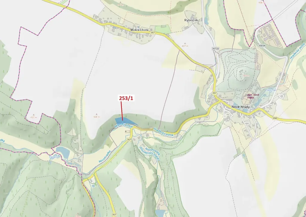 Lesní pozemek o výměře 7264 m2, parcelní číslo 253/1, podíl 1/1, katastrální území Mokrá Lhota, obec Nové Hrady, obec s rozšířenou působností Vysoké Mýto, okres Ústí nad Orlicí, Pardubický kraj.